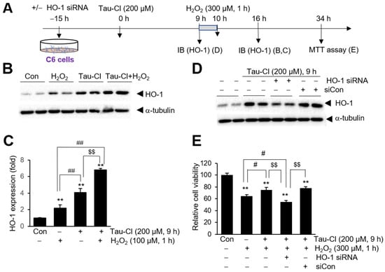 Suppression of Tau-Cl-mediated protective effects in H2O2-treated C6 cells by HO-1 knockdown. (A) Schematic diagram of time points for HO-1 knockdown, treatment of Tau-Cl and H2O2, and cell viability assay. (B,C) C6 cells were pre-treated with Tau-Cl (200 μM) for 9 h and then treated with H2O2 (100 μM) for 1 h. Protein levels of HO-1 were determined by immunoblotting at 6 h after H2O2 treatment. (D) C6 cells were transfected with HO-1 siRNA or non-specific siRNA (siCon). After 15 h, cells were treated with Tau-Cl (200 μM) for 9 h. HO-1 levels were determined by immunoblotting. Representative images of the protein levels are in B and D and quantified results are presented D as mean ± SEM (n = 3). (E) Cell viabilities of C6 cells after Tau-Cl pretreatment/H2O2 treatment with and without HO-1 siRNA transfection were examined using MTT assays at 24 h after H2O2 treatment. Results are presented as mean ± SEM (n = 3). ** p < 0.01 versus untreated controls, ## p < 0.01, # p < 0.05 and $$ p < 0.01 between indicated groups.