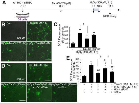 Suppression of H2O2-induced ROS production by Tau-Cl in C6 cells. (A) Schematic diagram of time points for HO-1 knockdown, treatment of Tau-Cl and H2O2, and ROS assay. (B,C) C6 cells were pre-treated with Tau-Cl (200 μM) for 9 h and then treated with H2O2 (300 μM) for 1 h. Intracellular ROS levels were measured using CM-H2DCFDA at 1 h after H2O2 treatment. (D,E) C6 cells were transfected with HO-1 siRNA or non-specific siRNA (siCon), pre-treated with Tau-Cl (200 μM) for 9 h, and then treated with H2O2 (300 μM) for 1 h. ROS levels in C6 cells with and without HO-1 siRNA transfection were examined using CM-H2DCFDA at 1 h after H2O2 treatment. Results are presented as mean ± SEM (n = 3). The scale bar represents 100 μm. ** p < 0.01, * p < 0.05 versus untreated controls, # p < 0.05 and ## p < 0.01 versus H2O2 controls, $ p < 0.05 and & p < 0.05 between indicated groups.
