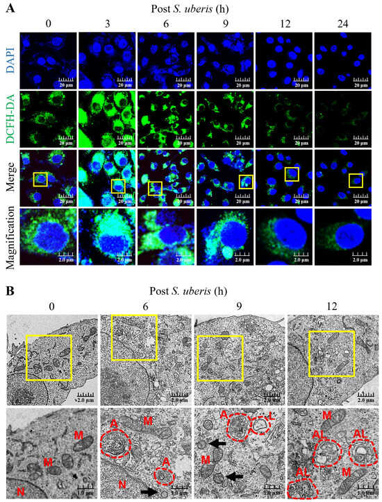 Oxidative stress in S. uberis-infected mMECs was gauged by intracellular ROS concentrations until 24 h post S. uberis challenge. Dichlorofluorescein diacetate (DCFH-DA) relative fluorescence emissions (as a measure of ROS concentrations) were higher at 3 to 9 h, but decreased by 12 and 24 h post S. uberis (Figure 1A). Infection with S. uberis induced autophagy and autolysosome formation in mMECs, as observed by transmission electron microscopy (TEM) (Figure 1B). Moreover, infected mMECs had mitochondrial vacuolization, autophagosome and lysosome formation and fusion at 12 h post challenge, whereas S. uberis were located intracellularly at 6 and 9 h post challenge.