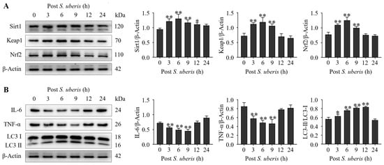 Infecting mMECs with S. uberis induced antioxidant and autophagy marker proteins and reduced inflammatory cytokines. (A) Western blot analyses of antioxidative Sirt1, Keap1 and Nrf2 isolated from S. uberis-challenged mMECs. Proteins were collected up to 24 h post challenge. (B) Inflammatory IL-6 and TNF-α, and autophagy of LC3II/LC3I, were also analyzed following S. uberis challenge. Mean and standard deviation (three independent experiments) of proteins (quantified with ImageJ 1.49v, http://imagej.nih.gov/ij, accessed on 18 December 2023). * p < 0.05, ** p < 0.01 (compared to the Sham).