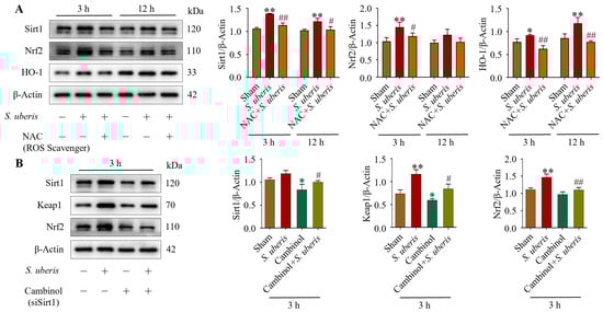 NAC pretreatment in S. uberis-challenged mMECs mitigated antioxidative responses. (A) Levels of Sirt1, Nrf2 and HO-1 in mMECs pretreated with 30 μM NAC and 1 h later challenged with S. uberis. (B) Levels of Sirt1, Keap1 and Nrf2 in mMECs pretreated with 40 μM Cambinol (siSirt1) and 6 h later challenged with S. uberis. Data were derived from assessments of Western blots and are mean ± SD of three independent trials. * p < 0.05 and ** p < 0.01 (compared to the Sham); # p < 0.05 and ## p < 0.01 (compared to the S. uberis group).
