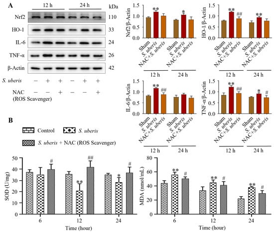 Pretreatment with NAC attenuated inflammatory and cellular damage in S. uberis-challenged mMECs and mammary glands by reducing oxidative stress. (A) Antioxidative Nrf2 and HO-1 and inflammatory IL-6 and TNF-α were determined in mMECs pretreated with NAC (30 μM) and 1 h later challenged with S. uberis. (B) Levels of total SOD and MDA activities at 6, 12 and 24 h post S. uberis challenge and pretreatment with NAC. Data represent mean ± SD of three independent experiments. * p < 0.05 and ** p < 0.01 (compared to the Sham); # p < 0.05 and ## p < 0.01 (compared to the S. uberis group).