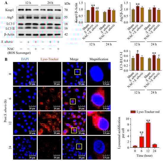 Pretreatment with NAC in the presence of S. uberis impaired autophagy and antioxidative Keap1 at 12 and 24 h post challenge. Levels of Keap1, Atg5 and LC3II/LC3I were upregulated (p < 0.01) in S. uberis-challenged groups (Figure 5A); these levels peaked at 12 h compared to 24 h post S. uberis in cells pretreated with NAC (Supplementary Figure S4). Increased Lyso-Tracker red fluorescence (p < 0.01), indicative of autophagy, was observed in S. uberis-challenged mMECs (Figure 5B). Red fluorescence intensity increased from 0 to 6 and 12 h post challenge, but had subsequently decreased by 24 h.