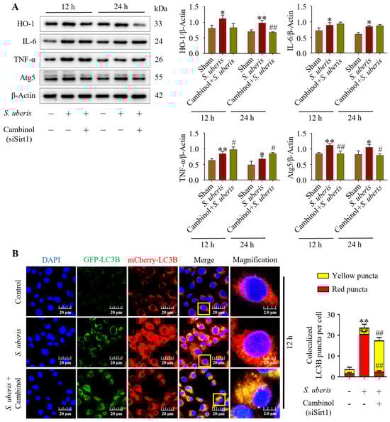 Concentrations of HO-1, IL-6, TNF-α and Atg5 were upregulated (p < 0.05) in mMECs challenged by S. uberis, but concentrations were reduced in mMECs pretreated with Sirt1 inhibitor (Cambinol) before S. uberis challenge (Figure 6A). In response to siSirt1 treatment, expressions of IL-6 increased numerically along with increases (p < 0.05) in TNF-α markers (Supplementary Figure S5). Autophagy dynamics changed in response to Cambinol. Vector Ad-mCherry-GFP-LC3B co-localized in autophagosomes in S. uberis-challenged cells (Figure 6B), but in Cambinol + S. uberis cells, the red fluorescence turned into yellow puncta (p < 0.01) due to a green GFP-LC3B co-localization in a non-acidic environment, indicative of autophagy inhibition.