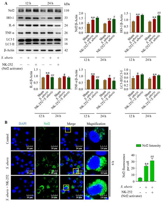 At 12 and 24 hpi, concentrations of antioxidants Nrf2, HO-1, inflammatory IL-6, TNF-α and autophagy LC3II/LC3I markers were evaluated in the presence of NK-252 (Nrf2 activator) to identify the effects of the antioxidative pathway on inflammation and autophagy mechanisms. The mMECs infected with S. uberis expressed increased (p < 0.01) concentrations of Nrf2, HO-1, IL-6, and TNF-α and increased LC3II/LC3I markers compared to the Sham (Figure 7A). However, IL-6 and TNF-α had decreased (p < 0.01) at 12 hpi with NK-252 + infection compared to infection of S. uberis (Supplementary Figure S6). Additionally, green fluorescence in the S. uberis + NK-252 group had stronger intensity (p < 0.01) than mMECs infected with S. uberis or non-infected mMECs (Sham) (Figure 7B), indicating Nrf2 activation at 6 hpi.