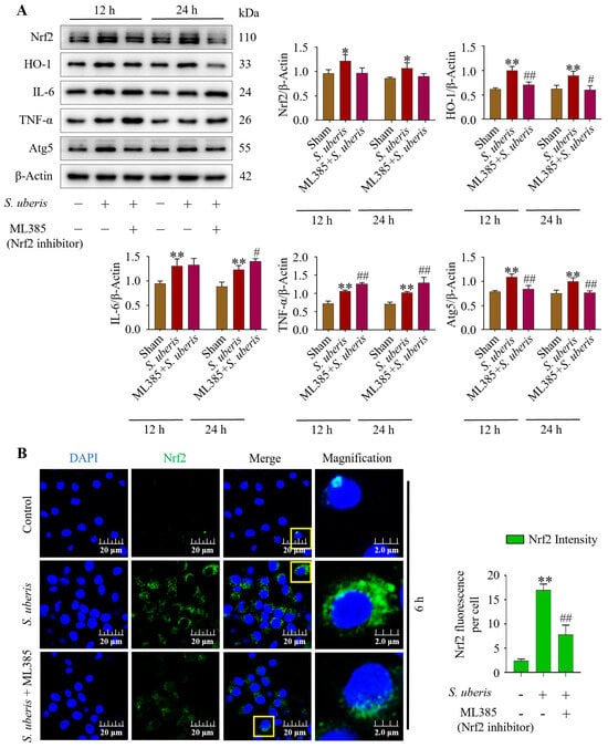 Suppression of antioxidative Nrf2 inhibited autophagy mechanism by increasing inflammation. (A) Nrf2 marker proteins were silenced by using 10 μM of ML385 in mMECs and Nrf2, HO-1, IL-6, TNF-α and Atg5 protein expression was analyzed at 12 and 24 h post S. uberis challenge. (B) Immunofluorescence confocal assay of Nrf2 in S. uberis-challenged mMECs. Quantitative image analysis of green Nrf2 intensity was conducted by ImageJ with JaCoP plugin in 10 cells/sample. Represented data are mean ± SD of three independent trials. * p < 0.05 and ** p < 0.01 (compared to the Sham); # p < 0.05 and ## p < 0.01 (compared to the S. uberis group). Magnified figure It comes from the yellow box.