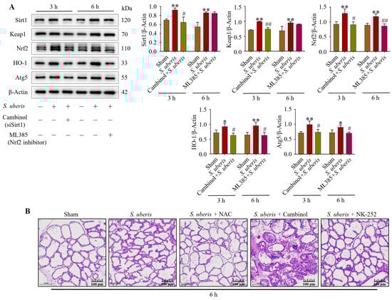 Expression of Sirt1, Keap1, Nrf2, HO-1 and Atg5 was upregulated (p < 0.01) in S. uberis-challenged mMECs (Figure 9A). However, silencing of Sirt1 with Cambinol downregulated (p < 0.05) Sirt1, Keap1, Nrf2, HO-1 and Atg5 at 3 h, whereas inhibition of Nrf2 downregulated (p < 0.05) Nrf2, HO-1 and Atg5 at 6 h (Supplementary Figure S8). Therefore, Sirt1 and Keap1 preceded Nrf2 and HO-1 in the antioxidative pathway. In the murine model of mastitis, Sham mammary glands did not have sloughed mammary epithelial cells (Figure 9B). In contrast, mammary glands infected with S. uberis had damaged mammary epithelial cells, irrespective of Cambinol treatment. Compared to the S. uberis and Cambinol + S. uberis group, histopathological inflammatory changes were lower in the NAC + S. uberis and NK-252 + S. uberis groups.