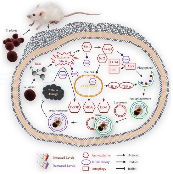 In conclusion, S. uberis infection induced oxidative stress in mouse mammary epithelial cells, which activated an antioxidative pathway that mitigated inflammatory responses and reduced cellular damage (Figure 10). Inflammation could thus be attenuated by the antioxidative pathway and autophagy mechanism.