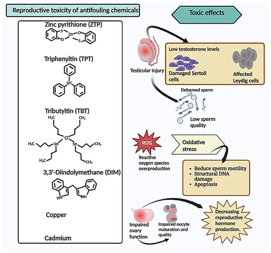 As explored in the comprehensive analysis, oxidative damage to cells may have a detrimental effect on male fertility. This damage has the potential to disturb the lipids present in sperm mitochondrial membranes and hinder specific protein kinases. Moreover, it can elevate the level of damage sustained by sperm DNA, leading to a decrease in the sperm motility, count, and overall function, influencing the sperm morphology as well. It is widely acknowledged that an impaired regulation of the molecular mechanisms responsible for ROS production engenders oxidative stress. Consequently, we have examined the influence of antifouling agents, namely ZPT, TBT, and TPT, on ROS production regulation as well as their impact on important antioxidant enzymes, SOD, CAT, and GPx, which participate in the detoxification of ROS. Gaining a comprehensive understanding of the mechanisms underlying the male reproductive toxicity induced by ZPT and other antifouling compounds can aid in developing a more targeted and efficient screening approach for these chemicals. Additionally, this knowledge may enable the prioritization of chemicals with limited data for further evaluation and assessment.