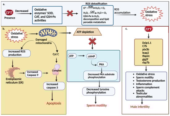 Up to this point, several researchers have presented findings on the toxicological mechanisms of ZPT on male reproductive function. Figure 2 provides a concise summary of these mechanisms. Numerous studies have indicated that ZPT can induce the excessive production of ROS, leading to the development of oxidative stress [,,,]. As illustrated in Figure 2a, the impact of ZPT on male reproductive toxicity involves interference with ROS signaling mediation by promoting ROS overproduction. Consequently, this disturbance can lead to alterations in oxidative stress markers by reducing the presence of crucial enzymes such as GSH-Px, SOD, and CAT. These enzymes play a pivotal role in neutralizing ROS through various chemical processes, including the breakdown of hydrogen peroxide and lipid peroxide metabolism []. Any disruption in these processes ultimately leads to the development of oxidative stress.