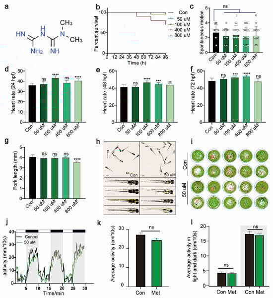Metformin has no significant effect on the growth, development, or activity of zebrafish larvae. (a) The chemical formula of metformin. (b) Survival rate curve of zebrafish larvae from 0 to 96 hpf (%survival, n = 15). (c) Tail swing frequency of 30 hpf zebrafish larvae (swing per minute, n = 15). (d) Heartbeat of 24 hpf zebrafish larvae (beats per minute, n = 30). (e) Heartbeat of 48 hpf zebrafish larvae (beats per minute, n = 30). (f) Heartbeat of 24 hpf zebrafish larvae (beats per minute, n = 30). (g) Statistical graph of the fork length of 96 hpf zebrafish larvae (mm, n = 15). (h) Morphological images of 96 hpf zebrafish larvae observed under a stereomicroscope (scale bar: 350 μm). There were no significant differences in morphology between the 50 μM metformin-treated group and the control group. The data were analyzed using one-way ANOVA and the log-rank test. All the experiments were repeated three times. (i,j) The behavioral rhythms of the control group (n = 10/group) and the 50 μM metformin group (n = 10/group) after 3 days were observed under conditions of 14 h of light and 10 h of alternating darkness (LD). (k) The behavioral rhythms of the Con group (n = 10/group) and Met group (n = 10/group) were observed on day 3 under continuous light (LL) conditions. (l) The 30 min behavioral rhythms of the Con group (n = 10/group) and Met group (n = 10/group) were observed under continuous light (LL) and continuous darkness (LD) conditions. (**** p < 0.0001, *** p < 0.001, ** p < 0.01, “ns”, no statistical difference).