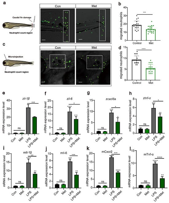 Metformin (Met), a well-known oral antidiabetic medication, not only reduces insulin resistance and hepatic glucose production but also modulates immune responses [,]. It dampens cytokine production in macrophages and lymphocytes [,] and inhibits the NF-κB signaling pathway []. Moreover, metformin promotes the proliferation of regulatory T cells, which are crucial for tempering overactive immune responses [,]. Despite these known effects, the specific impact of metformin on neutrophilic inflammatory behavior has not been fully explored. Due to the optical transparency exhibited by zebrafish during their embryonic and larval stages, they serve as an ideal model for studying innate immunity. We aimed to leverage this advantage of zebrafish larvae by utilizing the transgenic zebrafish model Tg(lyz:EGFP). This model enables us to investigate whether metformin affects the recruitment of neutrophils to inflammatory sites in organisms.