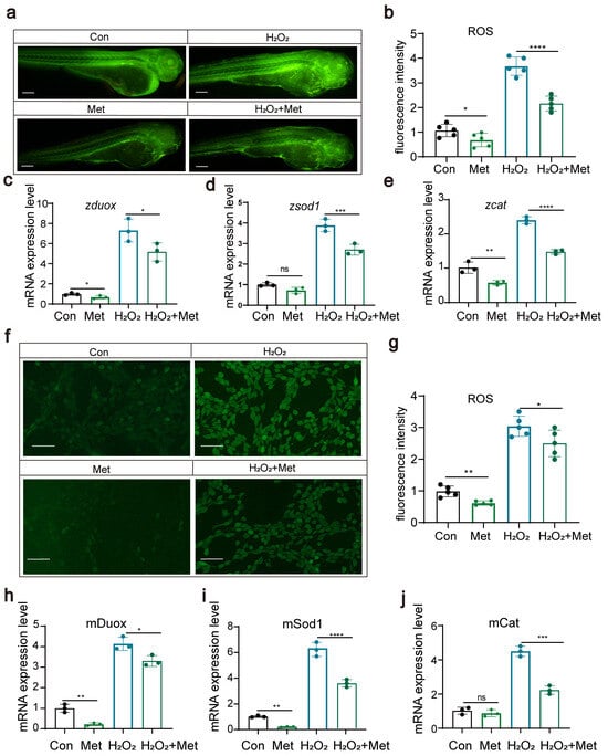 Metformin can reduce reactive oxygen species levels in zebrafish and cells (a,b). The results of fluorescence staining showed that metformin downregulated the level of ROS in zebrafish and that H2O2 upregulated the level of ROS (scale bar: 200 μm). The addition of metformin alleviated the effect of H2O2 on reactive oxygen species in zebrafish (n = 25). (c–e) Q-PCR results showing that metformin treatment reduced the upregulation of H2O2-induced expression of duox, sod1, and cat in zebrafish. (f,g) Fluorescence staining results showing that metformin downregulated ROS and that H2O2 upregulated ROS in murine macrophages. The addition of metformin alleviated the effect of H2O2 on reactive oxygen species in murine macrophages. (h–j) Q-PCR results showing that metformin treatment reduced the upregulation of H2O2-induced expression of duox, sod1, and cat in murine macrophages. (**** p < 0.0001, *** p < 0.001, ** p < 0.01, * p < 0.05, “ns”, no statistical difference).