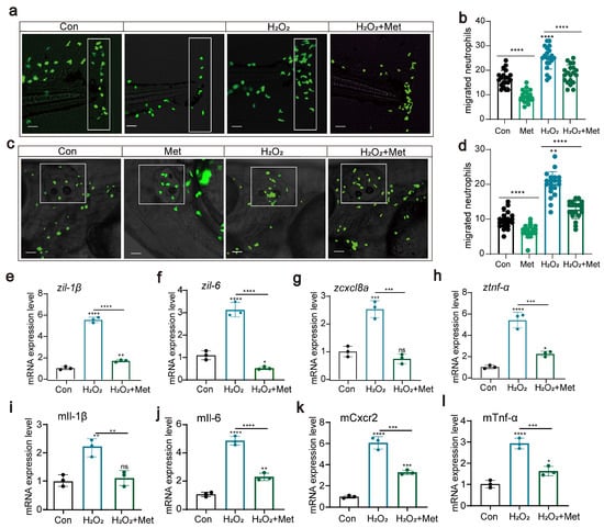 In further experiments, we deliberately increased the intracellular levels of reactive oxygen species to investigate their potential impact on neutrophil migration and immune function. We conducted experiments using two acute inflammation models, tail fin injury, and otolith vesicle injury to assess the effect of hydrogen peroxide treatment on neutrophil migration. Surprisingly, under conditions of elevated reactive oxygen species concentrations, neutrophil migration was significantly enhanced (Figure 4a–d). Moreover, hydrogen peroxide treatment induced the upregulation of the expression of these proinflammatory cytokines (tnf-α, iL-1β, iL-6, and cxcl8a) (Figure 4e–h), and the immune response was also strengthened. This finding is consistent with previous results showing elevated reactive oxygen species levels and upregulated expression of proinflammatory factors, suggesting that hydrogen peroxide might affect neutrophil migration by upregulating reactive oxygen species levels and the expression of proinflammatory factors. However, when we introduced metformin as an intervention, this effect was significantly suppressed. Although the levels of reactive oxygen species remained high, under the influence of metformin, both the migration capability of neutrophils and the immune response were significantly weakened compared to those in the untreated group. In the cell experiments, we also evaluated the effect of metformin on the levels of reactive oxygen species. Similarly, metformin significantly reduced the levels of proinflammatory factors (Figure 4i–l). These findings suggested that hydrogen peroxide treatment might induce the expression of proinflammatory factors by activating the oxidative stress response, leading to an inflammatory reaction, whereas metformin can inhibit this phenomenon.
