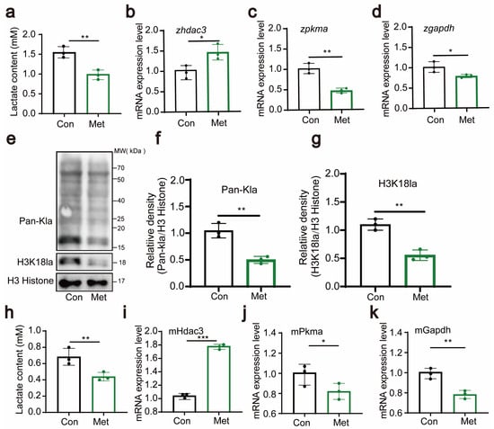 The results showed that after metformin treatment, the lactate concentration significantly decreased (Figure 5a), indicating that metformin has a regulatory effect on lactate levels. Additionally, we observed changes in the expression levels of the hdac3, pkma, and gapdh genes, with their expression downregulated by metformin treatment (Figure 5b–d). These genes play crucial roles in the metabolism of lactate, and their downregulation implies a potential impact on the metabolic rate of lactate. These findings suggest that metformin may regulate the metabolism of lactate by affecting the expression of these lactate enzyme-related genes. At the protein level, we examined the lactation levels of zebrafish histone proteins and found that metformin significantly downregulated H3 histone lactation modifications, especially the H3K18 site (Figure 5e–g). In the cellular experiments, we also measured lactate levels and the expression of genes such as hdac3, pkma, and gapdh. Like in the zebrafish experiments, metformin treatment resulted in a significant decrease in the intracellular lactate concentration, suggesting its impact on cellular lactate metabolism (Figure 5h). Moreover, the expression of genes such as hdac3, pkma, and gapdh also changed (Figure 5i–k). These results support the view that metformin affects intracellular histone lactylation by regulating lactate enzyme-related genes. Combining the results from the zebrafish and cellular experiments, we concluded that metformin affects lactate enzyme-related genes in zebrafish/immune cells and downregulates histone lactylation.