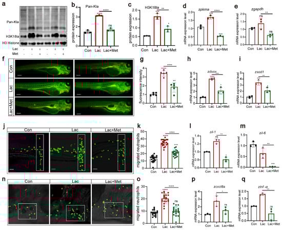In our previous research, we found that metformin had a significant effect on decreasing histone lactylation. Based on this discovery, we further explored the effect of lactate on lactylation and H3K18 lactylation, examining the role of metformin in this context. Western blot results clearly showed that, compared to those in the Con group, the lactate group exhibited significant increases in overall lactylation and H3K18 lactylation levels (Figure 6a–c). However, when lactate and metformin were combined, this lactate-induced upregulation was effectively inhibited. Additionally, lactate significantly enhanced the expression of the pkma and gapdh genes (Figure 6d,e). However, in the group treated with both lactate and metformin, the expression of these genes was notably suppressed, further demonstrating the ability of metformin to regulate lactylation modifications. Regarding reactive oxygen species, we noted that lactate not only increased the production of reactive oxygen species in zebrafish (Figure 6f,g) but also significantly upregulated the expression of the oxidative stress-related genes duox and sod1. These findings suggested that lactate might regulate the generation of reactive oxygen species by activating the oxidative stress pathway. Finally, we conducted experiments using two acute inflammation models, tail fin injury and otolith sac injury, to investigate the effects of lactate treatment on neutrophil migration. We observed that after lactate treatment in zebrafish, whether in tail cut or otolith sac injury experiments, the lactate group demonstrated a significant increase in neutrophils. The addition of metformin weakened neutrophil migration, consequently reducing the inflammatory response in the body (Figure 6j–q). These findings align with previous findings of increased reactive oxygen species levels, suggesting that lactate might influence neutrophil migration behavior by upregulating reactive oxygen species levels.