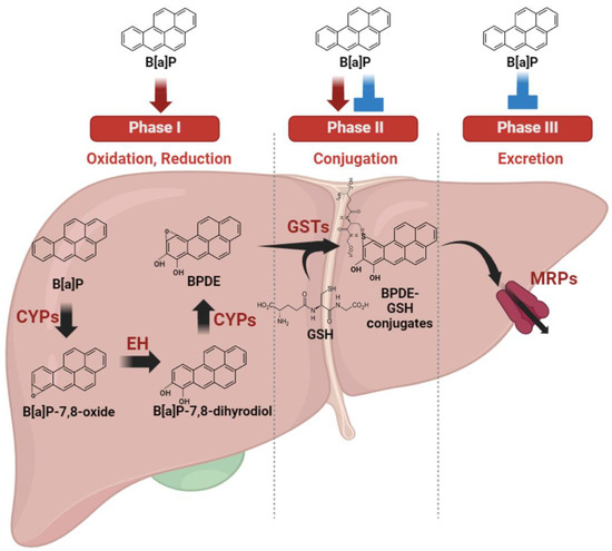 The liver exhibits heightened sensitivity to B[a]P compared with other organs due to its central role as the primary site for drug metabolism (Figure 2). As the primary organ responsible for xenobiotic drug metabolism, the liver significantly contributes to minimizing drug toxicity. This organ undertakes a multi-phase process in xenobiotic metabolism. Phase I involves cytochrome P450 oxidases catalyzing the oxidation or reduction in xenobiotic materials. In phase II, these modified xenobiotics are conjugated with other polar compounds by specific phase II enzymes. Finally, phase III involves the excretion of conjugated xenobiotic materials from cells through efflux transporters, effectively eliminating them from the cells [31].