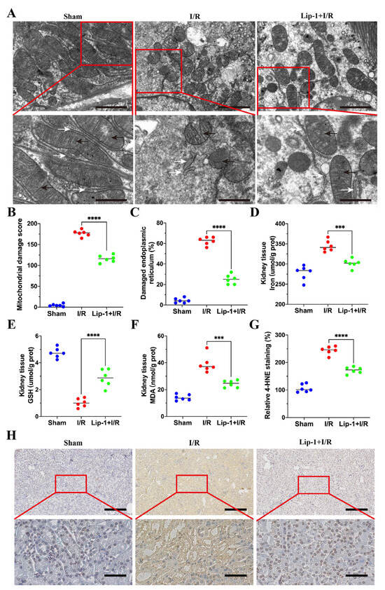 Lip-1 suppressed ferroptosis of renal tubular cells in I/R-induced AKI. (A) TEM images of renal tubular cells from diverse groups, bar: 2 μm (top) and 1 μm (bottom). The black arrows indicate mitochondria and the white arrows indicate endoplasmic reticula. (B) Quantification of mitochondrial damage in TEM of the renal tubular cells. (C) Quantification of damaged endoplasmic reticulum in TEM of the renal tubular cells. (D) Iron level of kidney. (E) GSH level of kidney. (F) MDA level of kidney. (G) Quantification of 4-HNE staining in kidney. (H) 4-HNE staining of kidney, bar: 200 μm (top) and 50 μm (bottom). *** p < 0.001, **** p < 0.0001.