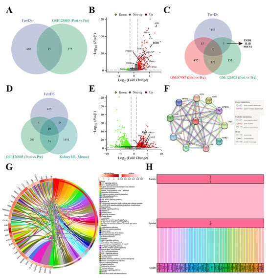 EGR1 might be a key regulator of ferroptosis in I/R-induced AKI. (A) Venn diagram of FerrDb and GSE126805 (post vs. pre). (B) Volcano plot of GSE126805 (post vs. pre). (C) Venn diagram of FerrDb, GSE87487 (post vs. pre), and GSE126805 (post vs. pre). (D) Venn diagram of FerrDb, GSE126805 (post vs. pre), and kidney samples of mouse model (I/R vs. control). (E) Volcano plot of kidney samples of mouse model (I/R vs. control). (F) The STRING interaction network of EGR1 (Homo sapiens). (G) Chordal graph of KEGG in GSE126805 (post vs. pre). (H) Sankey diagram of EGR1 and its target in I/R-induced AKI model.