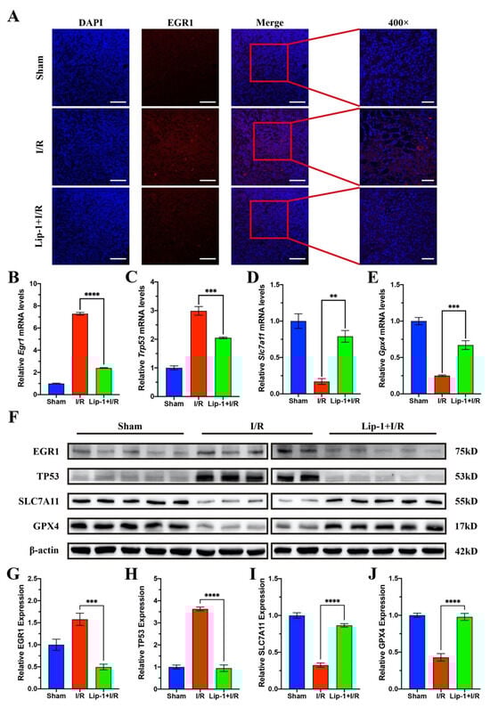 EGR1 obviously increased in the I/R group while Lip-1 treatment could significantly decrease the EGR1 expression (Figure 4A). According to previous reports, EGR1 could promote TP53 transcription [32,33]. The mRNA expression of Egr1 in the kidneys of the I/R group increased and mRNA expression of Trp53 was accordingly increased (Figure 4B,C). As SLC7A11 was the target of TP53 [34,35], the mRNA expression of Slc7a11 and Gpx4 were downregulated (Figure 4D,E). These changes were evidently reversed by Lip-1 treatment, and these results were further validated through WB (Figure 4F–J). The above results indicated that Lip-1 suppressed ferroptosis of I/R-induced AKI via regulating EGR1/TP53/SLC7A11.