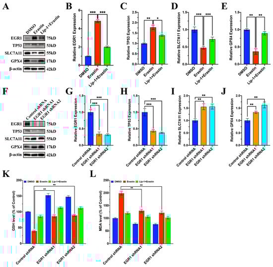 Lip-1 inhibited ferroptosis of HK2 cells via regulating EGR1. (A–E) WB assay of HK2 cell with DMSO, erastin, and Lip-1+erastin treatment. (F–J) WB assay of HK2 cell with EGR1 knockdown. (K) GSH levels of HK2 with DMSO, erastin, and Lip-1+erastin treatment after EGR1 knockdown. (L) MDA levels of HK2 with DMSO, erastin, and Lip-1+erastin treatment after EGR1 knockdown. * p < 0.05, ** p < 0.01, *** p < 0.001.
