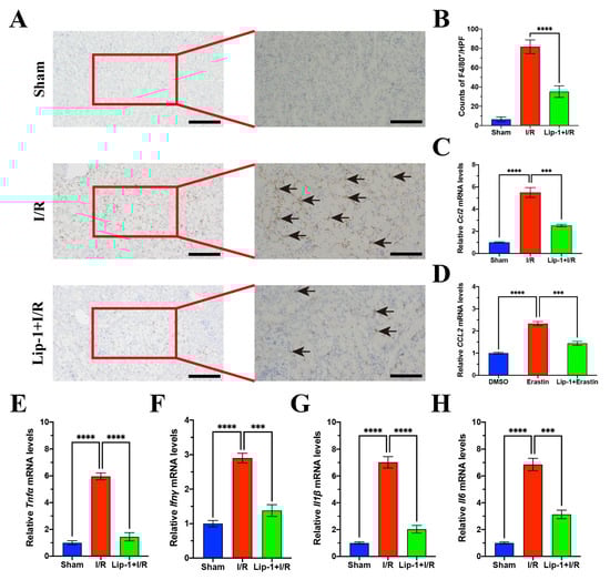 The infiltrated F4/80+ macrophages in the kidneys of the I/R group markedly increased, while F4/80+ macrophages distinctly decreased with Lip-1 treatment (Figure 6A,B). CCL2, acting as a chemokine, could trigger the recruitment of F4/80+ macrophages. We then detected Ccl2 expression in the kidney samples of mice, and it was discovered that Lip-1 could reduce the mRNA expression of Ccl2 (Figure 6C). According to the previous reports [36,37], EGR1 could stimulate CCL2 transcription and secretion. Based on the Sankey diagram (Figure 3H) and the data from a previous paper [31], we found that the expression of Ccl2 increased in the erastin group. The increased expression of CCL2 in the erastin group of HK2 cells could be reduced by Lip-1 administration (Figure 6D). In addition, the inflammatory factors (Tnfα, IFNγ, Il1β, and Il6) significantly increased in the I/R group and these inflammatory factors decreased in the Lip-1+I/R group (Figure 6F–H). These results suggest that ferroptosis of renal tubular cells induced kidney inflammation via recruiting macrophages and releasing inflammatory cytokine, which could be reduced by Lip-1.