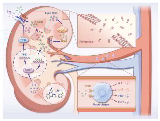 In summary, our research proved that Lip-1 could alleviate I/R-induced AKI via suppressing ferroptosis (Figure 7). Our investigation indicated that (i) Lip-1 suppressed ferroptosis of renal tubular cell in I/R-induced AKI; (ii) EGR1 might be a key regulator of ferroptosis in I/R-induced AKI; (iii) Lip-1 inhibited ferroptosis of renal tubular cell via regulating EGR1/TP53/SLC7A11; and (iv) Lip-1 reduced infiltration of macrophages and release of inflammatory cytokines. This work paves the theoretical basis of new therapeutic strategies for I/R-induced AKI.