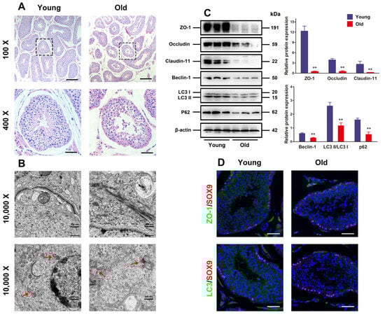Autophagy defect and BTB dysfunction in old porcine testes. (A) The histological variations in the testes are appraised with HE staining. The changes in seminiferous tubules (original magnification = 100×, scale bar = 200 μm) are presented in the upper panels. The magnified images of the boxed areas are exhibited in the lower panels (original magnification set at 400×, scale bar = 50 μm). (B) The ultrastructure of autophagy and TJ function in porcine SCs is observed by TEM (original magnification = 10,000×, scale bar = 500 nm). (C) The relative expressions of Claudin-11, ZO-1, Occludin, Beclin-1, and LC3 proteins in testicular tissues are determined by means of Western blotting. (D) Representative images of immunofluorescence for localization of ZO-1 and LC3 (green) by virtue of SOX9 (red) in the testes are obtained. With β-actin as the loading control, values are expressed by mean ± SD. ** p < 0.01 vs. the young group.