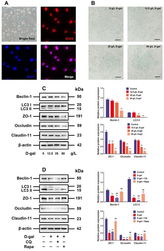 Alteration of autophagy affected TJ function in D-gal-induced aging porcine SCs. (A) The SCs are identified via morphological observation and immunofluorescence analysis with SOX9. (B) The D-gal-induced SC senescence is determined by SA-β-gal staining (original magnification: 100×, scale bar = 200 μm). (C) SCs are treated with 0, 12.5, 20, and 50 g/L D-gal for 48 h. Western blotting is performed on Beclin-1, LC3, ZO-1, Occludin, and Claudin-11 proteins. (D) SCs are subjected to 48 h of treatment with D-gal and/or CQ plus rapamycin. Beclin-1, LC3, ZO-1, Occludin, and Claudin-11 proteins are analyzed through Western blotting, with β-actin as the loading control. The mean ± SD is applied to exhibit the values; * p < 0.05 and ** p < 0.01 vs. the control group; ## p < 0.01 vs. the D-gal treatment group.