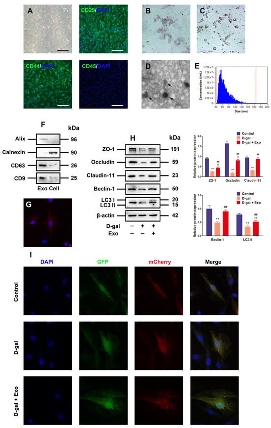 Characterization of BMSC-Exos and Exos inhibits D-gal-induced autophagy defect and TJ dysfunction in porcine SCs. (A) Morphological observation and immunofluorescence analysis of CD29, CD44, and CD45 are identified from the porcine BMSCs (original magnification = 100×, scale bar = 200 μm). (B,C) Phenotypes of porcine BMSCs differentiating into adipocytes and osteocytes are determined by light microscopy. (D) TEM is adopted for Exo analysis, scale bar = 500 nm. (E) The diameters of Exos are measured using nanoparticle trafficking analysis (NTA). (F) Western blotting is employed to detect the expressions of positive markers (Alix, CD63, and CD9) and negative markers (Calnexin) in Exos. (G) Fluorescence image of PKH67-labeled Exos taken up by porcine SCs is presented. (H) ZO-1, Occludin, Claudin-11, Beclin-1, and LC3 proteins are examined through Western blotting provided with the loading control of β-actin. (I) Autophagy is visually observed via transfection of SCs with mCherry-GFP-LC3 adenovirus and quantitation of autolysosomes. The mean ± SEM is selected to present the values; ** p < 0.01 vs. the control group; ## p < 0.01 vs. the D-gal treatment group.