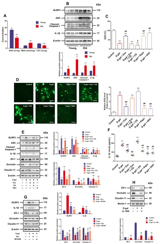 BMSC-Exos recover TJ function by increasing autophagic flux, so as to inhibit ROS generation and NLRP3 inflammasome activation in D-gal-induced aging porcine SCs. (A) SOD, MDA, and CAT content in young and old porcine testes is detected. (B) Western blotting is carried out to measure the relative protein expressions of NLRP3, ASC, Cleaved-Caspase-1, and IL-1β in porcine testes. (C) GSH level is calculated (n = 6). (D) Total ROS levels are detected with DCFH-DA (scale bar = 50 μm). (E) SCs are treated with D-gal (50 g/L), CQ (50 μM), NAC (5 mM), and/or BMSC-Exos (20 μg/mL) for 48 h. The protein expressions of NLRP3, ASC, Cleaved-Caspase-1, IL-1β, ZO-1, Occludin, and Claudin-11 are researched by means of Western blotting. (F) IL-1β secretion is investigated by ELISA by virtue of cell culture supernatant fractions (n = 6). (G) SCs are treated with D-gal (50 g/L), MCC950 (10 μM), and/or BMSC-Exos (20 μg/mL) for 48 h. NLRP3, IL-1β, ZO-1, Occludin, and Claudin-11 are researched for their protein expressions via Western blotting. (H) SCs undergo 48 h of D-gal (50 g/L) and/or IL-1Ra (20 ng/mL) treatment. Western blotting is executed to probe into ZO-1, Occludin, and Claudin-11 for protein expressions, during which β-actin serves as the loading control, and the values are expressed by mean ± SD; * p < 0.05 and ** p < 0.01 vs. the control group; # p < 0.05 and ## p < 0.01 vs. the D-gal treatment group.