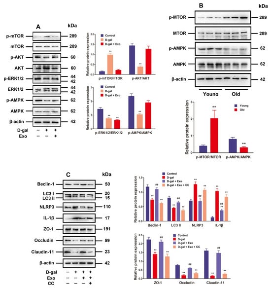 BMSC-Exos regulate autophagy and TJ function through the AMPK/mTOR signaling pathway. (A) SCs are subjected to D-gal (50 g/L) and/or BMSC-Exos (20 μg/mL) processing for 48 h. The protein expressions of p-mTOR, mTOR, p-AKT, AKT, p-ERK1/2, ERK1/2, p-AMPK, and AMPK are investigated using Western blotting. (B) Western blotting is performed to examine the relative expressions of p-mTOR, mTOR, p-AMPK, and AMPK proteins obtained from porcine testes. (C) SCs receive 48 h of treatment with D-gal (50 g/L), CC (10 μM), and/or BMSC-Exos (20 μg/mL). Western blotting for protein expressions of Beclin-1, LC3, NLRP3, IL-1β, ZO-1, Occludin, and Claudin-11 is accomplished with β-actin as the loading control and the values exhibited in the format of mean ± SD; ** p < 0.01 vs. the control group; ## p < 0.01 vs. the D-gal treatment group.