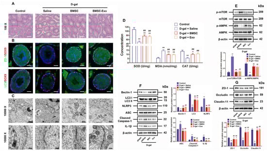 BMSCs and BMSC-Exos improve autophagy and BTB function while repressing ROS generation and NLRP3 inflammasome activation in the testes of D-gal-induced aging mouse model. (A) The histological changes in testes are appraised with the help of HE staining (100× for original magnification, scale bar = 200 μm). (B) Typical immunofluorescence images for SOX9 (red)-based localization of ZO-1 and LC3 (green) in the testes are generated (original magnification = 400×, scale bar = 50 μm). (C) TEM is applied to visualize the ultrastructure of autophagy and TJ in porcine SCs (10,000× indicating original magnification; scale bar = 500 nm). (D) Changes in SOD, MDA, and CAT content are examined. (E) The measurement of relative expressions of p-mTOR, mTOR, p-AMPK, and AMPK proteins in mouse testes is realized through Western blotting. (F) Beclin-1, LC3, NLRP3, ASC, Cleaved-Caspase-1, and IL-1β in mouse testes are detected for relative protein expressions using Western blotting. (G) Western blotting for determining the relative protein expressions of ZO-1, Occludin, and Claudin-11 in mouse testes is conducted by setting β-actin as the loading control and the value format of mean ± SD; * p < 0.05 and ** p < 0.01 vs. the control group; ## p < 0.01 vs. the D-gal treatment group.