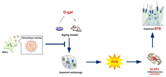 In summary, it is evidenced by the present study that BMSC-Exos effectively alleviate the BTB function of ageing porcine testes by activating autophagy while inhibiting ROS/NLRP3 inflammasomes through the AMPK/mTOR signaling pathway. The obtained findings provide new insights into the therapeutic effect of BMSC-Exos on rehabilitating the senescent porcine SCs from TJ function and ameliorating the aging mouse model for BTB function.