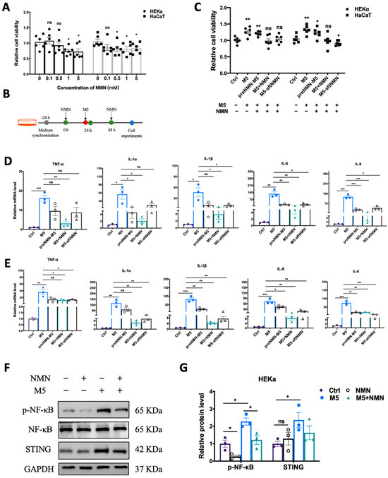 NMN decreased cell viability and inflammatory response in M5-treated keratinocytes. (A) MTT analysis. Cell viability of HEKa and HaCaT cells under different concentrations of NMN (0.1, 0.5, 1, and 5 mM) (n = 6 biological replicates). (B) Flow diagram of NMN treatment in cells. (C) MTT analysis (n = 6 biological replicates). Cell viability of HEKa and HaCaT under M5 stimulation and different time courses of NMN treatment: pre-NMN M5, NMN-M5, and M5 after NMN. Relative mRNA levels of the proinflammatory cytokines TNF-α, IL-1α, IL-1β, IL-6, and IL-8 were detected in HEKa cells (D) and HaCaT cells (E) (n = 3 biological replicates). (F) Immunoblotting of inflammation and autoimmune proteins, p-NF-κB/NF-κB, and STING (n = 3 biological replicates). (G) Relative quantification of (F). Data are presented as means ± SEM; n = 3 or 6 biological replicates; * p < 0.05, ** p < 0.01, and *** p < 0.001; ns, no significance.