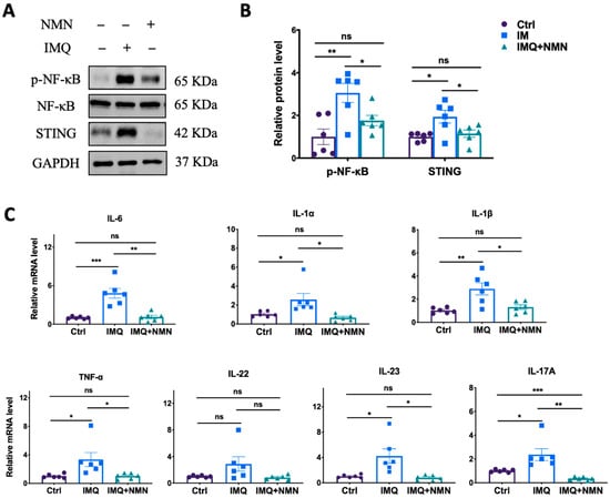 Subsequently, parts of these skins were collected for the detection of related protein and mRNA levels in inflammation and immune responses. The results revealed that NMN supplementation ameliorated the IMQ-induced upregulation of p-NF-κB and STING (Figure 3A) and the inflammatory cytokines TNF-α, IL-1α, IL-1β, IL-6, IL-22, IL-23, and IL-17A (Figure 3C).