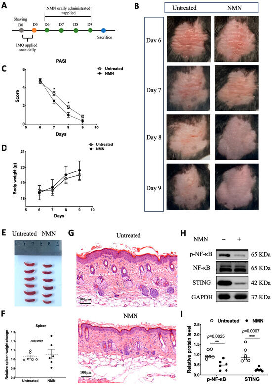 In previous results obtained from HaCaT cells, NMN treatment after M5 displayed a certain retrieval effect. Thus, we wondered if NMN could aid the recovery process of IMQ-induced psoriatic inflammation in the skin. We first prepared a group of mice stimulated with IMQ for 5 days (n = 12) and recorded their body weight every day. From day 6 to day 9, six of the IMQ mice were randomly selected to be administered NMN supplementation, and another six of them served as an untreated control (Figure 4A). After a 4-day treatment with NMN, psoriasis-like inflammatory skin recovered better when compared to the untreated group (Figure 4B). PASI scores, which decreased in the NMN group, were evaluated by three dermatologists who were blind to the whole project (Figure 4C). Both groups displayed elevated body weight with no significant differences (Figure 4D). After the mice were sacrificed, their spleens were extracted and there was no significant difference when normalized by body weight (Figure 4E,F). Furthermore, H & E staining revealed that NMN treatment remitted epidermal hyperplasia distinctly (Figure 4G). Back skins were homogenized to detect related protein levels. Notably, p-NF-κB and STING levels decreased to a large extent in the NMN group according to the results (Figure 4H,I).