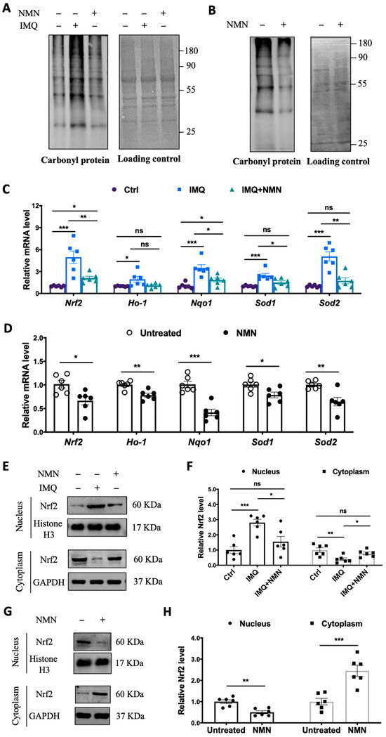 NMN supplementation inhibited oxidative stress in IMQ-induced psoriatic mice. (A) Immunoblotting of protein carbonyl levels (n = 3 mice per group) and (C) mRNA levels of Nrf2, Ho-1, Nqo1, Sod1, and Sod2 from three mouse groups: Ctrl, IMQ, and IMQ + NMN (n = 6 mice per group). (B) Immunoblotting of protein carbonyl levels and (D) mRNA levels of Nrf2, Ho-1, Nqo1, Sod1, and Sod2 from the two groups of mice: untreated and NMN (n = 6 mice per group). (E) Immunoblotting of Nrf2 in nucleus and cytoplasm from Ctrl, IMQ, and IMQ + NMN (n = 6 mice per group). (F) Relative quantification of (E). (G) Immunoblotting of Nrf2 in nucleus and cytoplasm from untreated and NMN (n = 6 mice per group). (H) Relative quantification of (G). Data are means ± SEM; * p < 0.05, ** p < 0.01, and *** p < 0.001; ns, no significance.