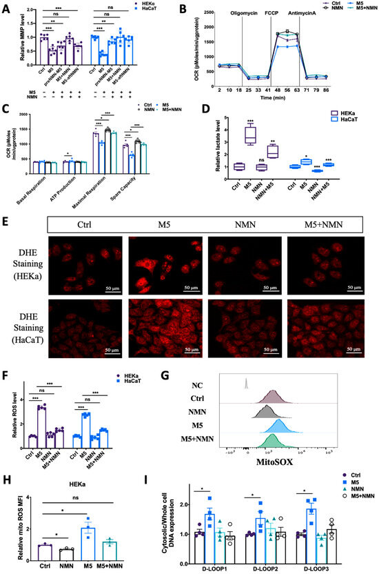 NMN ameliorated M5-induced mitochondrial dysfunction and oxidative stress in HEKa and HaCaT cells. (A) Relative mitochondrial membrane potential (MMP), evaluated using the JC-1 assay, in keratinocyte cell lines (n = 6 biological replicates). (B,C) Mitochondrial respiration measured via oxygen consumption rate (OCR) under the NMN and M5 treatments (n = 3 biological replicates). (D) Lactate levels were measured according to the manufacturer’s guidebook (n = 4 biological replicates). (E) DHE staining of intracellular ROS in HEKa and HaCaT cells under NMN and M5 treatments. (F) Relative intracellular ROS in HEKa and HaCaT under NMN and M5 treatments measured via DCFH-DA probe. (G) Mitochondrial ROS detected via MitoSOX. NC: no dye. Relative MFI results are shown in (H) (n = 3 biological replicates). (I) Relative mtDNA release in four groups assessed according to D-LOOP1/2/3 in cytosol and whole-cell lysates, normalized to the control group (n = 4 biological replicates). Scale bar: 50 μm. Data are means ± SEM; * p < 0.05, ** p < 0.01, and *** p < 0.001; ns, no significance.