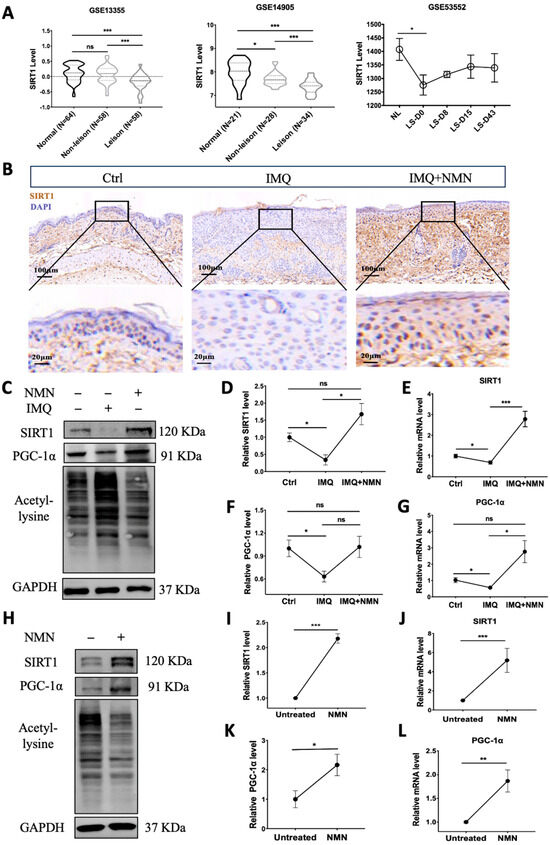 Notably, NAD+ biosynthesis and SIRT1 together play critical roles in regulating a variety of biological processes, including metabolism, stress response, inflammation, etc. [37]. We analyzed the gene expression of SIRT1 in the GEO dataset. GSE13355 and GSE14905 showed that SIRT1 mRNA expression was significantly decreased in lesional skin compared with normal skin from healthy individuals. The levels in non-lesion skin were also reduced in GSE14905. Moreover, GEO53552 revealed that SIRT1 mRNA levels increased to some extent after treatment with anti-IL-17 receptor antibody but still could not reach the normal level (Figure 7A). Then, we analyzed SIRT1 levels in the IMQ-induced psoriatic mouse skins from the control group, IMQ group, and IMQ + NMN group through immunohistochemistry. The IHC results were consistent with the GEO analysis, showing that SIRT1 was decreased in psoriatic skin, accompanied by decreased PGC-1α levels and elevated lysine acetylation, while with the supplementation of NMN, both protein and mRNA levels of SIRT1 and PGC-1α could be restored (Figure 7B–G). Not surprisingly, NMN supplementation significantly increased SIRT1 and PGC-1α levels and decreased lysine acetylation (Figure 7H–L). Moreover, mtDNA copies were increased under the NMN treatment, indicating that the number of mitochondria was augmented (Supplementary Figure S1).