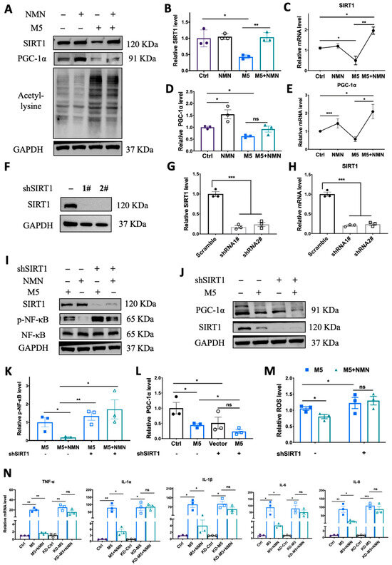 Knockdown of SIRT1 in vitro counteracted the protective effect of NMN against M5-induced inflammation and oxidative stress. (A–E) Immunoblotting of SIRT1, PGC-1α and lysine acetylation, and relative mRNA levels of SIRT1 and PGC-1α in Ctrl, NMN, M5, and M5 + NMN groups in HEKa and HaCaT cells. (F) Immunoblotting of SIRT1 in shRNA-transfected HEKa cells. (G,H) Protein and mRNA levels of SIRT1 after transfection. (I) Immunoblotting of inflammation proteins and p-NF-κB/NF-κB. (J) Immunoblotting of PGC-1α. (K) Relative quantification of (I). (L) Relative quantification of (J). (M) Relative intracellular ROS in HEKa under NMN and M5 treatment measured using a DCFH-DA probe. (N) mRNA levels of proinflammatory cytokines TNF-α, IL-1α, IL-1β, IL-6, and IL-8 were detected in HEKa cells. Data are means ± SEM; n = 3 biological replicates; * p < 0.05, ** p < 0.01, and *** p < 0.001; ns, no significance.