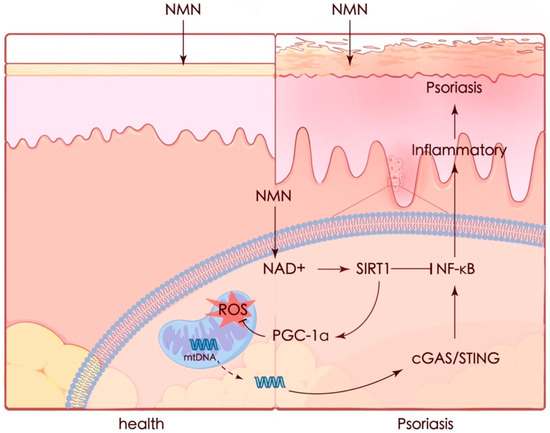 Psoriasis is a complicated and progressive skin disorder accompanied by an autoimmune inflammatory response in pathogenesis. Although there are plenty of treatment methods for patients, the limitations of these treatments have already been noted, including adverse effects and treatment resistance. In our study, we demonstrated that NMN could ameliorate psoriasis-like symptoms and inflammation in an IMQ-stimulated mouse model and improve therapeutic prognoses by activating the SIRT1 pathway. The protective effect of NMN against M5 in vitro was diminished by the knockdown of SIRT1. NMN enhanced PGC-1α levels and helped maintain mitochondrial function by increasing mitochondrial respiration, eliminating ROS, and restoring mtDNA release which led to the activation of the cGAS/STING pathway (Figure 9).