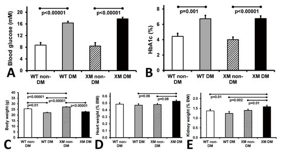 Kidney weight, which is usually increased in people and animals with diabetes, was increased in both diabetic groups, as expected, and renal fibrosis and renal mitochondrial oxidative stress markers were increased in the diabetes groups, more so in the XM group. The kidney is also a high energy demand organ, and mitochondrial damage is implicated in diabetic nephropathy, including tubulopathy, which is usually reflected by increased albuminuria, which was evident in the diabetic XM [10,60,61]. The diabetic XM also exhibits markedly increased renal and glomerular fibrosis, in keeping with likely renal filtration damage. Perhaps with longer diabetes duration or addition of other more detailed measures of renal function, plasma creatinine differences may have been observed between our study groups of non-diabetic and diabetic mice.