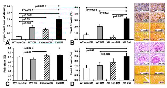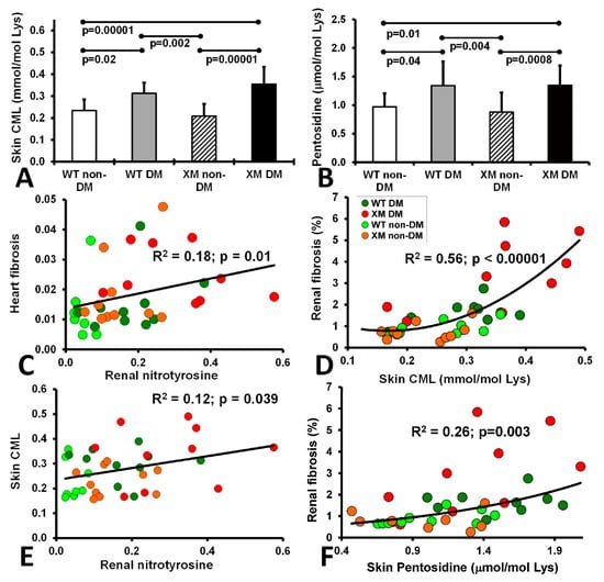 A tissue which can be used as a good long-term measure of glycation and oxidative stress is tissue collagen; e.g., skin AGEs, which in humans are usually increased in diabetes per se, and also in kidney damage, and are associated with and predictive of long-term complications, including advanced kidney disease and mortality [56,57]. Abundant AGEs are CML and pentosidine, which we quantified using gold-standard biochemical techniques, were found to be significantly increased in both diabetic vs. non-diabetic mouse groups and significantly higher in the diabetic vs. non-diabetic XM. Skin CML also correlated positively with renal nitrotyosine levels.