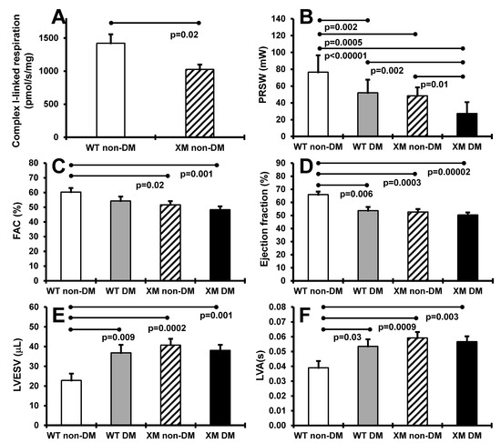 Measurements of cardiac systolic functions. (A). Maximal ADP-stimulated respiration rate in heart mitochondria from non-diabetic WT and XM. (B). Preload recruitable stroke work (PRSW) of the four mouse groups on the day of sacrifice. The bars represent the levels of PRSW in milliwalts (mW) expressed as mean values ± standard error of the mean of the group of 10 animals. (C). Left ventricular fractional area change (FAC) of the four mouse groups on the day of sacrifice. The bars represent the percentage of FAC as mean values ± standard error of the mean of the group of 10 animals. (D). The percentage of ejection fraction of the four mouse groups on the day of sacrifice. The bars represent the percentage of ejection fraction as mean values ± standard error of the mean of the group of 10 animals. (E). Left ventricular end-systolic volume (LVESV) of the four mouse groups on the day of sacrifice. The bars represent the levels of LVESV in microliter (μL) expressed as mean values ± standard error of the mean of the group of 10 animals. (F). Left ventricular activation time (LVA) of the four mouse groups on the day of sacrifice. The bars represent the LVA in seconds (s) as mean values ± standard error of the mean of the group of 10 animals.