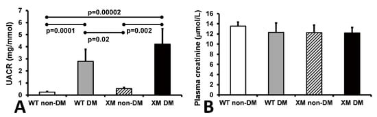 Renal function. Urine albumin/creatinine ratio (UACR) and plasma creatinine levels are shown in Figure 4. UACR was significantly increased in diabetic WT and XM groups, while plasma creatinine levels were not significantly different between any groups.
