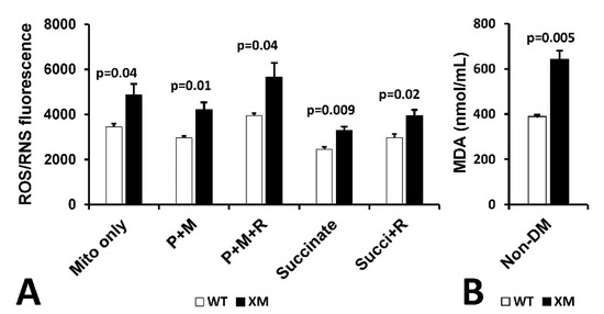 Mitochondrial reactive oxygen/reactive nitrogen (ROS/RNS) production and malondialdehyde (MDA) in kidney. Figure 6A shows mitochondrial H2O2/RNS production as measured by DCFDA in mitochondria isolated from kidney of non-diabetic WT and XM mice. Increased ROS/RNS production was observed in XM compared to WT in all conditions used. Figure 6B shows results of measurement of MDA levels in kidney homogenates from non-diabetic WT and XM, showing elevated MDA levels in the XM kidney.