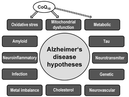 It is accepted that mitochondrial dysfunctions in the pathophysiology of AD involve the altered activities of several mitochondrial enzymes, including those in the OXPHOS system, mainly in the reduced activity of complex IV [,,]. The role of CoQ10 in bioenergetics led to the assumption that the availability and activity of CoQ10 may contribute to impaired energy metabolism in AD.