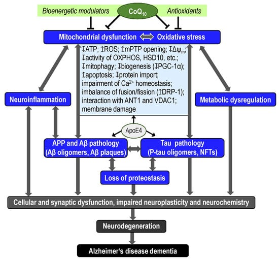 Simplified scheme of Alzheimer’s disease (AD) pathophysiology, with focus on the role of mitochondrial dysfunction. AD pathophysiology is associated with amyloid beta (Aβ) pathology (neurotoxicity of Aβ oligomers and plaques), tau pathology (neurotoxicity of tau oligomers and neurofibrillary tangles), mitochondrial dysfunction, oxidative stress, neuroinflammation, and loss of proteostasis. All these processes are interrelated and result in cellular and synaptic dysfunction, impaired neuroplasticity and neurochemistry, neurodegeneration (synaptic and neuronal loss and brain atrophy), cognitive decline, and AD dementia. Mitochondrial dysfunction associated with Aβ and tau pathology in AD includes decreased ATP production, mitophagy, biogenesis (peroxisome PGC-1α), activity of components of the OXPHOS system and other enzymes, mitochondrial membrane potential (Δψm), and import of mitochondrial proteins, imbalance of mitochondrial dynamics (DRP-1), impaired of intracellular Ca2+ homeostasis, membrane damage, interaction with ANT1 and VDAC1, and increased ROS production, apoptosis, and mPTP opening. Coenzyme Q10 (CoQ10), as a unique endogenous antioxidant and electron transporter in the OXPHOS system, may have a significant role in the pathophysiology and treatment of AD, primarily through the regulation of mitochondrial function. ANT1—adenine nucleotide translocator 1; ApoE4—apolipoprotein E4; APP—amyloid precursor protein; DRP-1—dynamin-like protein-1; HSD10—17β-hydroxysteroid dehydrogenase type 10; mPTP—mitochondrial permeability transition pore; NFTs—neurofibrillary tangles; OXPHOS—oxidative phosphorylation; PGC-1α—peroxisome proliferator-activated receptor gamma coactivator 1-alpha; P-tau—phosphorylated tau; ROS—reactive oxygen species; VDAC1—voltage-dependent anion channel 1.