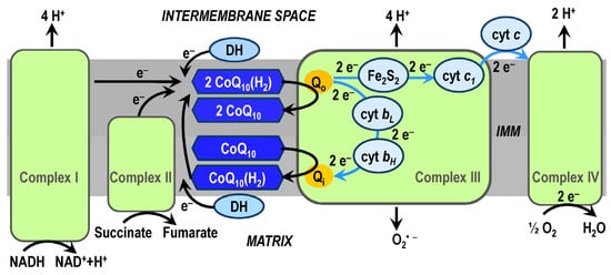 In general, mitochondrial dysfunction is associated with reduced ATP production, increased production of reactive oxygen species (ROS), release of proapoptotic factors, and disturbed calcium homeostasis. The reduced production of ATP is mainly caused by the impaired function of the oxidative phosphorylation system (OXPHOS), which includes a series of redox reactions ending in oxygen, during which the mitochondrial electron transport system (ETS) transfers electrons between the complexes of the respiratory chain with the formation of the proton motive force, but also of superoxide []. The essential carrier of electrons from complex I or from complex II to complex III is coenzyme Q (CoQ), especially CoQ10 in humans. The availability and activity of CoQ10 and the Q-cycle play a significant role in the effectiveness of the OXPHOS system. In addition, CoQ10 functions as a lipid antioxidant and a necessary factor for controlling protein uncoupling and opening mitochondrial permeability transition pores (mPTPs).